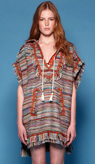 This morning, I came across Tory Burch’s 2012 Resort Collection. The New York Times’s T Magazine style blog wrote that the collection reflected bohemian Santa Fe with its “lobster, turquoise and desert sand” tones, and described this look as an “updated rendition of a Navajo poncho”: