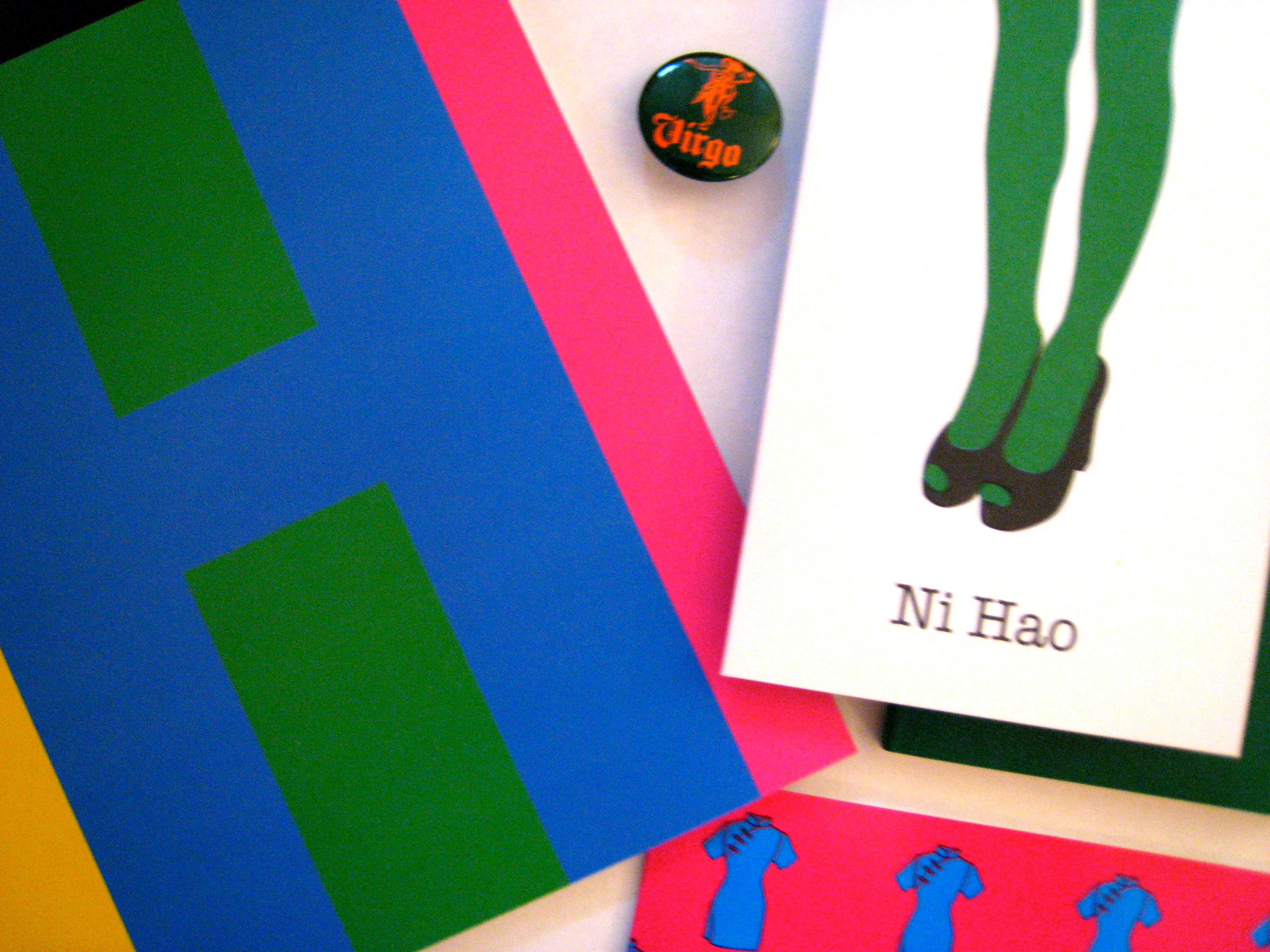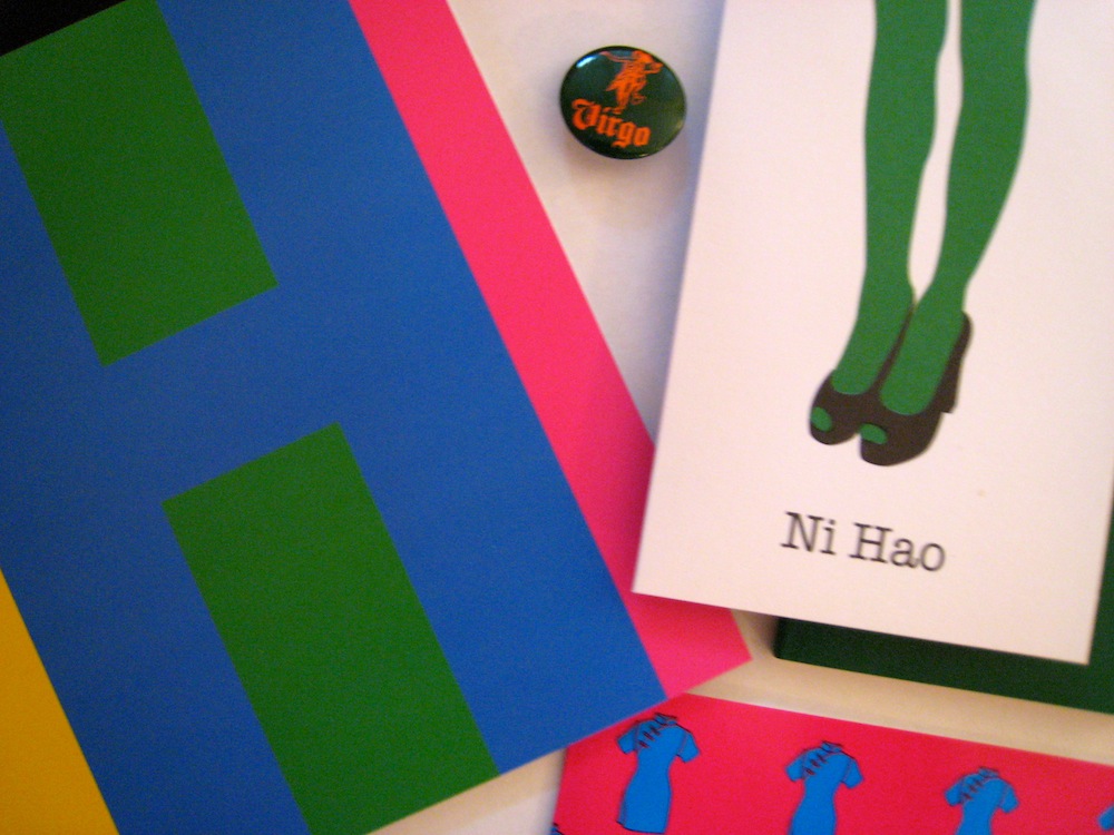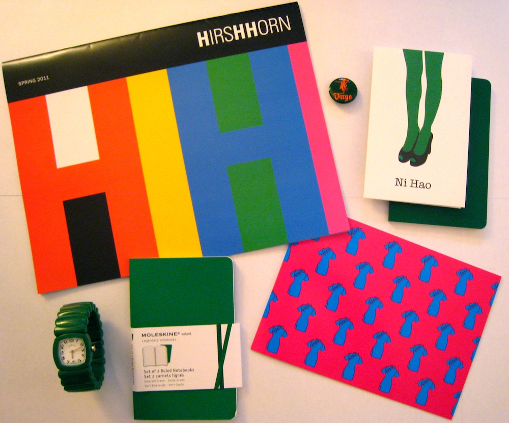 Clockwise from top left: Hirshhorn Museum program, Virgo button from Opening Ceremony, “Ni Hao” notecard, Moleskine notebook, cheongsam-printed notecard, another Moleskine notebook, Time Will Tell watch