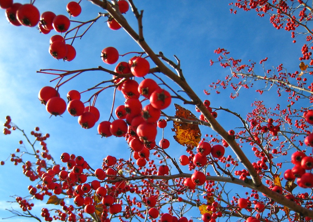 I loved the look of this red-berried tree against the powder blue sky: