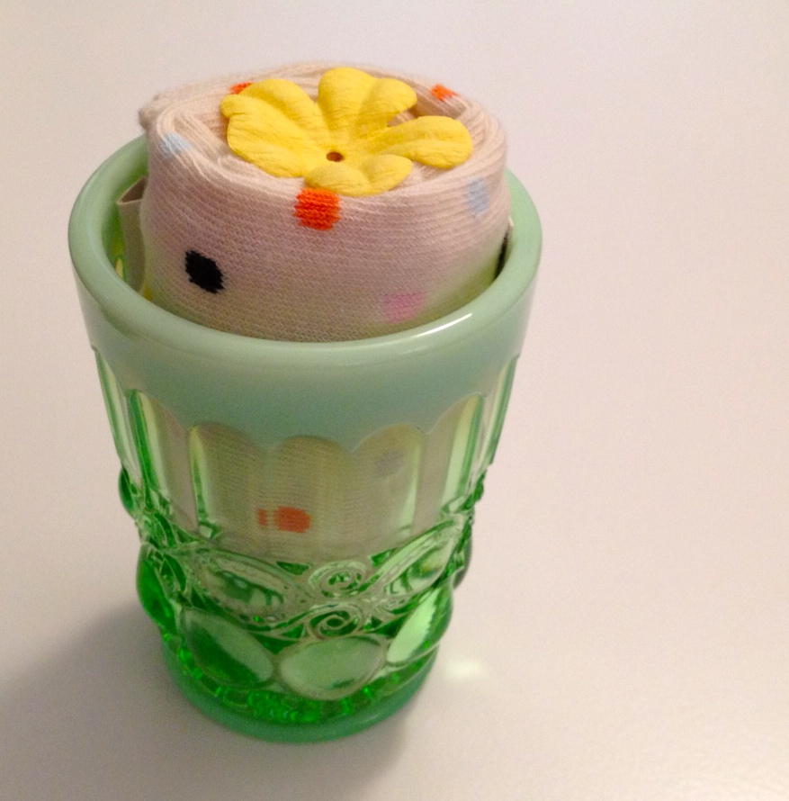 I liked its ornate and vintage look. My thinking was that she could use it on her dresser to hold cosmetics like mascara and lip pencil. As a gift, I needed to fill it with something too…like hard candies? Mints? Nah, too easy. And then I thought, hmm, what if I rolled something up? What would fit? Umm…socks? Now we’re talkin’. I found these whimsical, well-made socks at Nordstrom.