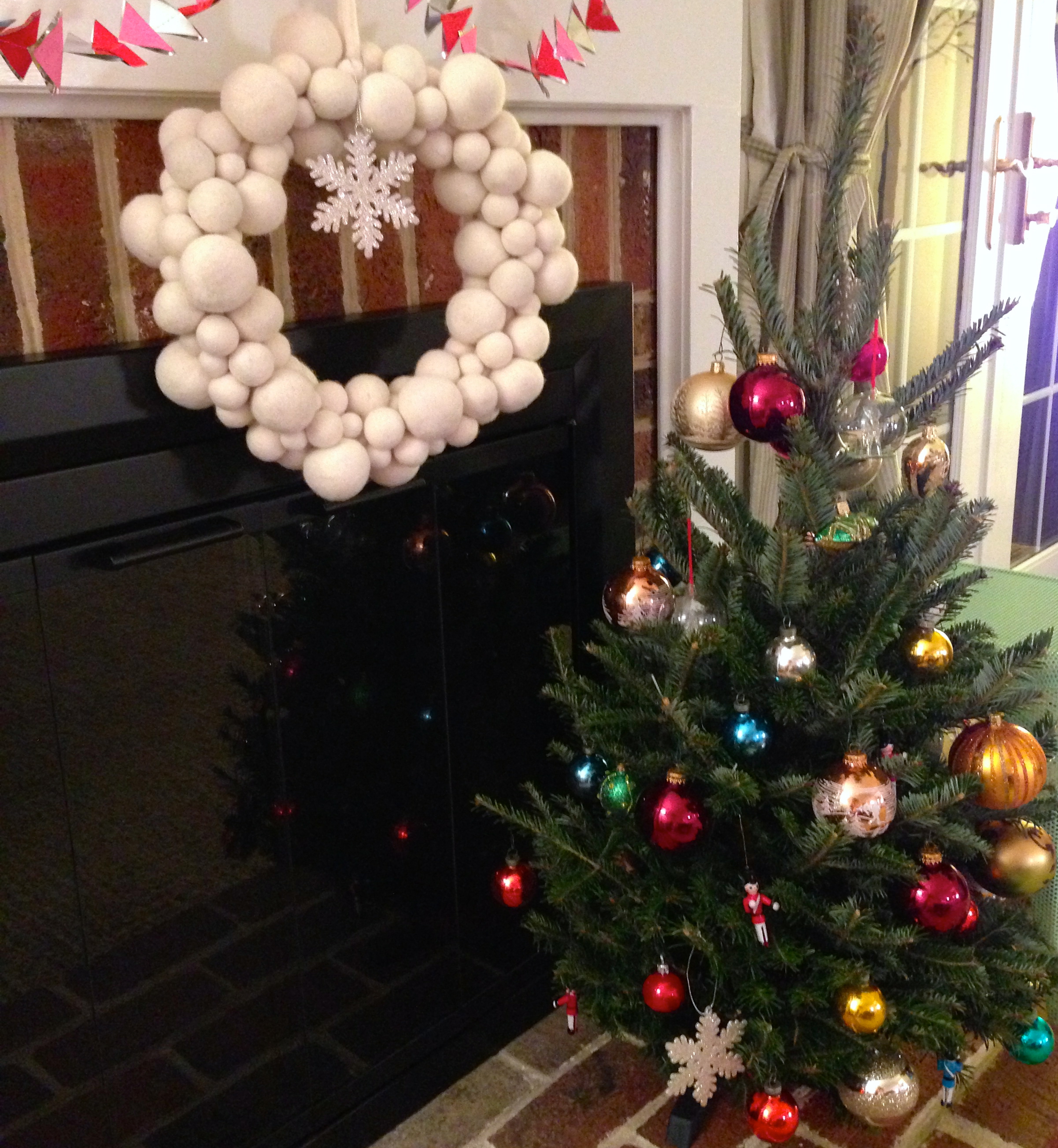 I bought the paper garland ($4), white felt wreath ($30), and silver glitter snowflake ($4) on sale at West Elm. I found our mini tree at Whole Foods for 50% off ($11). Most of the ornaments were passed down from my mom.