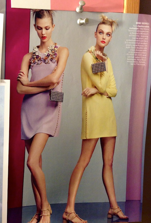 Models Karlie Kloss and Caroline Trentini in double-faced silk shift dresses with bejeweled necklines by Gucci. I just love the sweet (read: forgiving) silhouettes—you could actually eat dessert wearing these!