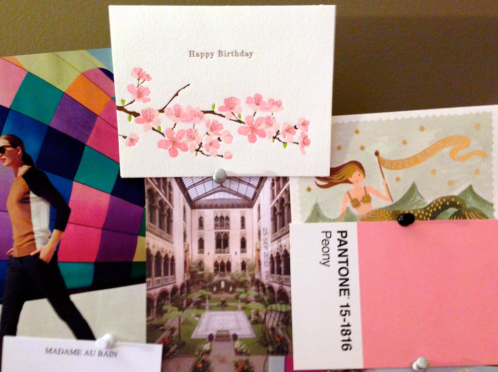 Items of note: the hot air balloon in the background of the J.Crew ad packs such visual punch…Living in DC, I like the cherry blossoms on the birthday card…Pantone Peony is pretty perfect.