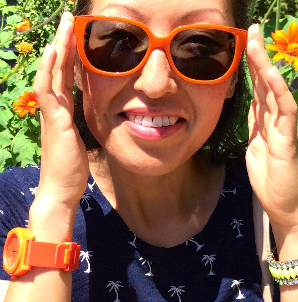 Sunkist orange accents for a sunkissed summer: Tory Burch sunglasses, Nixon watch, J.Crew palm tree tee.